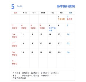 5月の診療カレンダーHOMEお知らせお知らせ5月の診療カレンダー 2026年3月5日 5月1日は院内研修のため、午後を休診します5月2日は臨時休診します通常、木曜日は午後休診ですが、5月7日は午後も診療しますよろしくお願いいたします お知らせ一覧 前のページへ